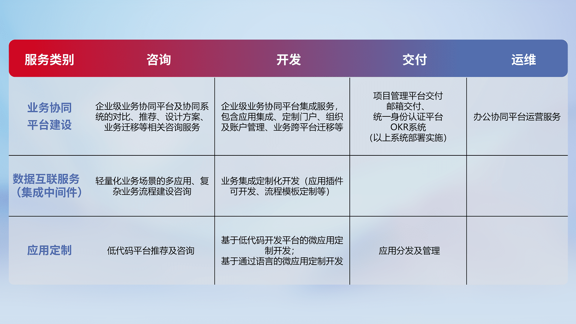 针对钉钉、、、、企微、、、IDaas等平台级产品提供产品的规划、、方案、、交付、、、定制化开发等服务,,,,实现如统一协同办公、、、智能客户服务、、、、混合会议管理、、、、智能数据查询、、、、等业务场景,,实现数字化转型。。。。