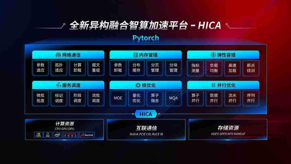 通过自研的服务层、、、中间适配层、、、以及调度编排算法,,,,采用数据并行、、、模型并行等多种并行方式,,,把并行计算任务进行有效的分解,,使其分别由相应的软件栈和算力资源来承接。。当GPU资源变化,,,HICA可以实时动态调度计算子任务并调整模型拓扑和架构,,,以充分聚合各种算力资源。。